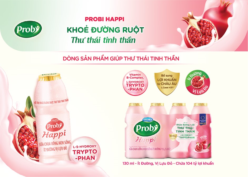 Trong nhiều loại sữa chua bổ sung probiotics này, có thể kể đến sản phẩm sữa chua uống men sống ít đường vị lựu đỏ Probi Happi của Vinamilk có chứa hàng tỷ lợi khuẩn L. Casei 431TM giúp cải thiện hệ tiêu hóa, ngoài ra còn bổ sung thêm hoạt chất hạnh phúc L-5-Hydroxytryptophan là tiền chất tạo ra nội tiết tố serotonin trong ruột, từ đó giúp tinh thần thêm thư thái, vui vẻ.