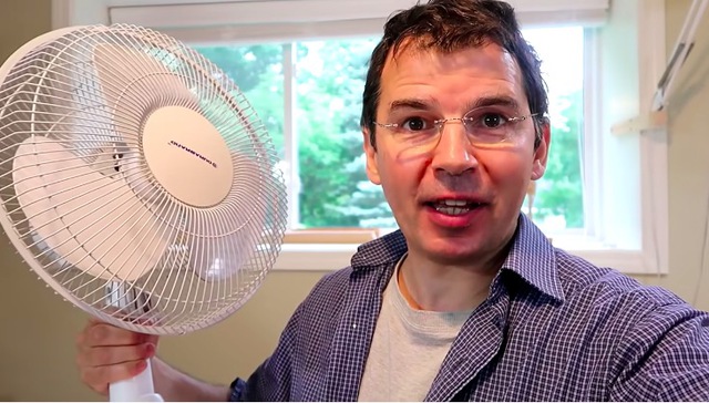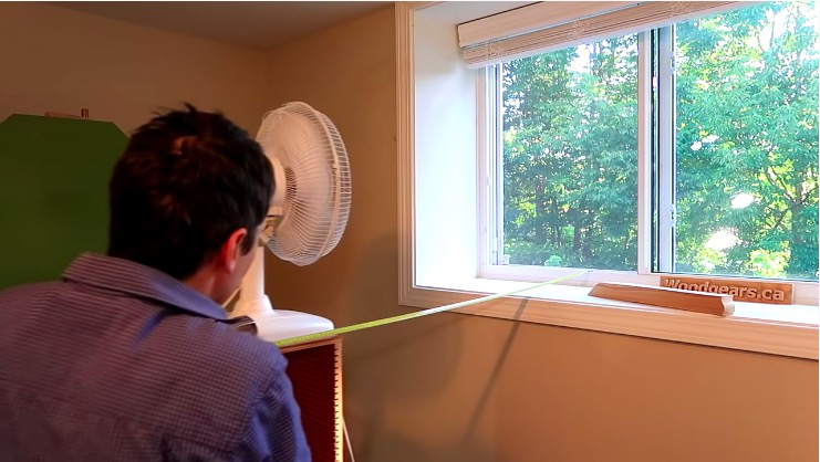 Đầu tiên, anh mở cửa sổ rồi đặt 1 chiếc quạt trước cửa sổ, hướng vào trong. Cùng lúc, một máy đo gió chuyên dụng được khởi động. Trong suốt quá trình quạt hoạt động, con số ở máy đo gió gần như không có thay đổi quá nhiều. Hay nói cách khác, việc bật quạt theo kiểu này gần như không đem lại lợi ích gì cho việc làm mát hay lưu thông không khí cho căn phòng.