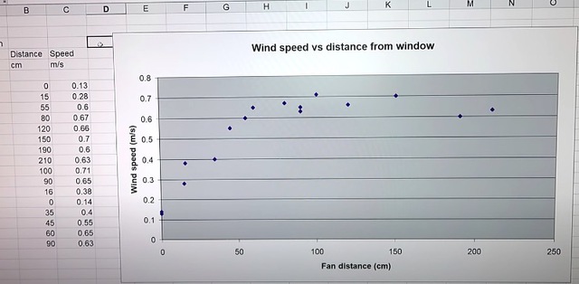 Ở một căn phòng khác, anh chàng cũng đặt một chiếc quạt lên cửa sổ để mở, tuy nhiên hướng quạt thổi quay ra ngoài. Lúc này, con số trên máy đo bắt đầu có sự chuyển động. Để quạt xa cửa sổ hơn nhưng vẫn hướng ra ngoài, khoảng 55cm, tốc độ gió biểu thị trên máy đo tăng từ 0,13 lên 0,6m/s. Nếu đặt quạt xa hơn nữa, cửa sổ từ 0,5 - 2,1m, hiệu quả thông gió trong phòng đạt rất tốt.