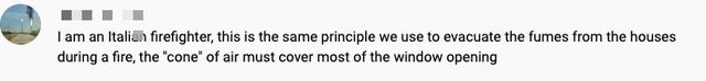 Một vài người dùng khác, tự xưng họ là lính cứu hoả cũng cho biết thêm, phương pháp dùng quạt quay ra ngoài tương tự như cách họ xả khói từ các căn phòng, ngôi nhà đang gặp hoả hoạn. Họ sẽ đặt quạt ở một quảng cách nhất định so với cửa sổ. Từ đó khói và khí nóng sẽ được thổi ra ngoài. Bởi vậy, ta thường thấy khói bốc ra và toả nhiều ở khu vực cửa sổ.