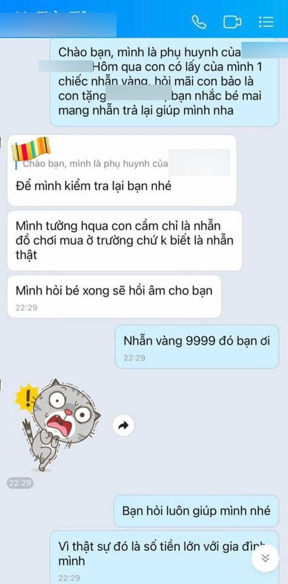 Bà mẹ này sau đó đề nghị vị phụ huynh kia gọi con dậy hỏi luôn vì chị đang cần gấp. Tuy nhiên, vị phụ huynh cho rằng bà mẹ này phiền và chặn luôn tin nhắn, khiến bà mẹ hốt hoảng, băn khoăn không biết có nên báo công an luôn.