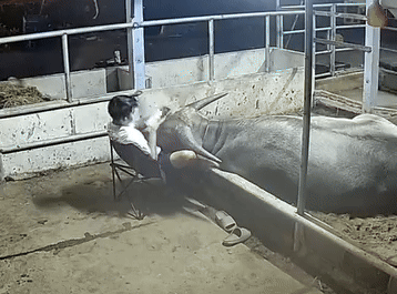 Theo đoạn clip ghi lại, người đàn ông mang ghế ra chuồng trâu, ngồi trò chuyện, vuốt ve con trâu đầy tình cảm. Đáp lại ông chủ của mình, con trâu cũng tỏ ra khá hiền lành, gác đầu lên chân ông chủ.