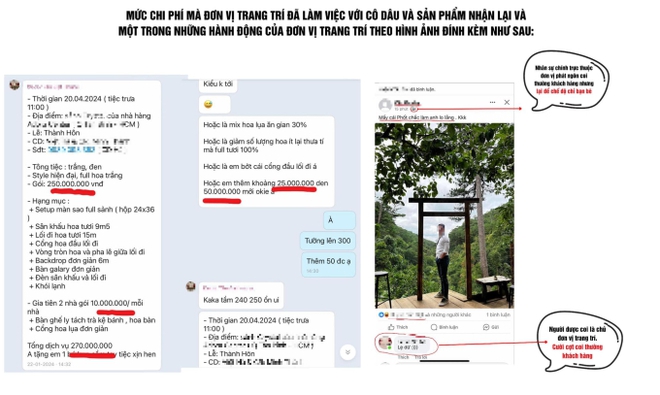 Việc thỏa thuận hợp đồng, lên phương án thiết kế, chốt phương án thực hiện được hai bên làm việc từ ngày 21/1. Gần đến ngày lễ, 6/4, phía trang trí tiệc cưới cũng không trực tiếp qua làm việc để nắm rõ không gian dựng khung rạp. Đồng thời, cô dâu cũng đồng ý bỏ ra số tiền lớn để chốt 2 bó hoa cầm tay là hoa nhập.