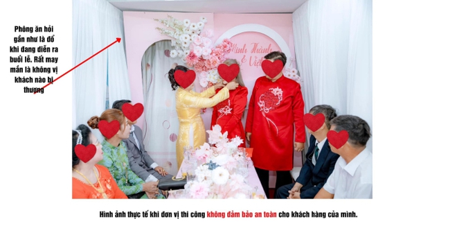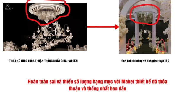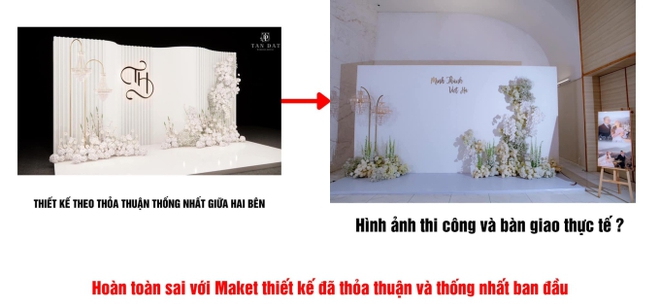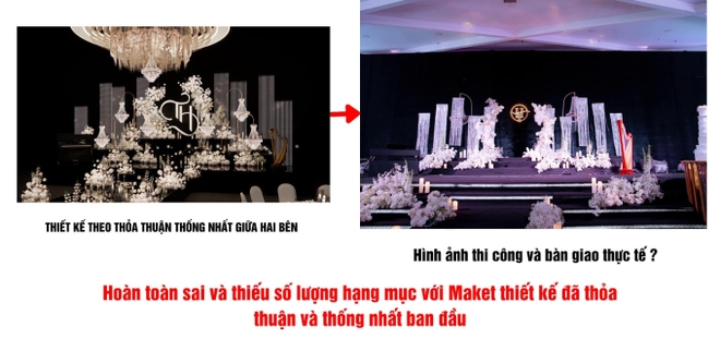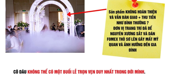 Các hình ảnh được chia sẻ từ bài đăng đều cho thấy không gian tiệc cưới sau khi trang trí không đúng với thiết kế đã thỏa thuận trước đó. Đến ngày lễ cưới diễn ra, hội trường cũng không được như mong đợi, cô dâu xuất hiện trên lễ đường cũng không có một tấm ảnh nào đẹp và dùng được, các góc đều lộ ghép ẩu.