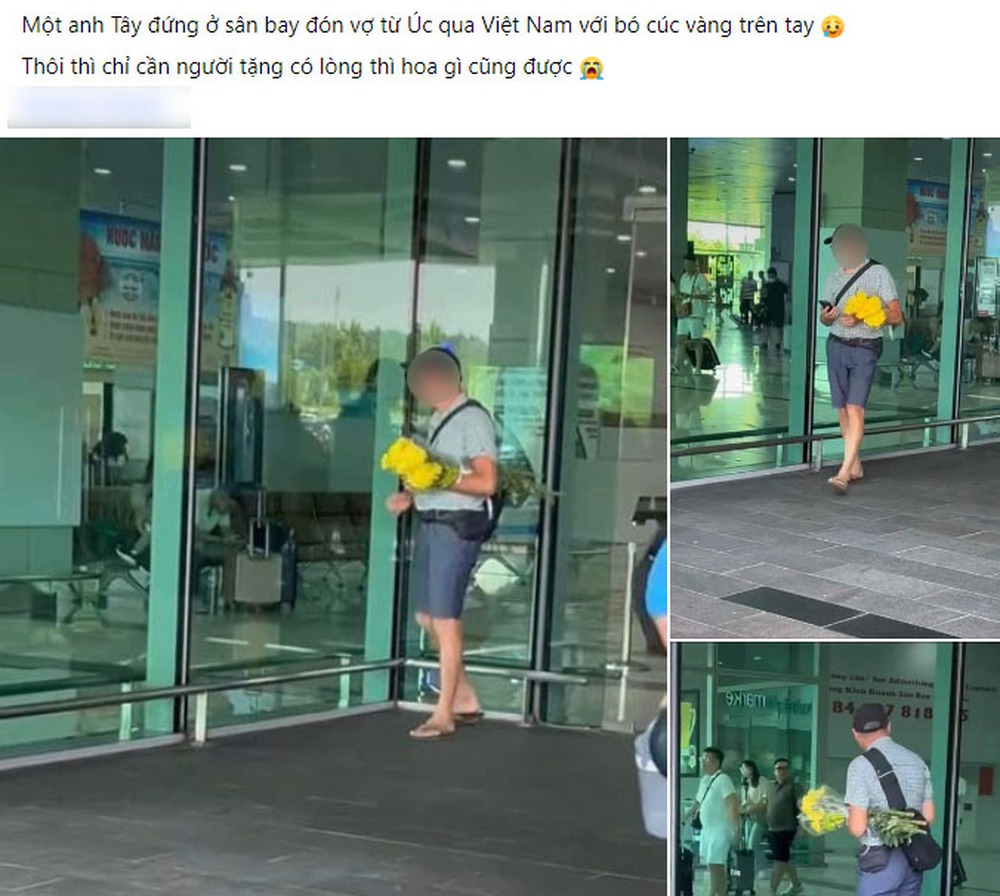 Mới đây, MXH xuất hiện hình ảnh một người đàn ông ngoại quốc đứng ở sân bay như đang chờ đón người thân. Trên tay của người đàn ông này có cầm 3 bó hoa cúc vàng, loại hoa thường được người Việt Nam dùng để thờ cúng. Hình ảnh được chia sẻ khắp cõi mạng kèm dòng trạng thái: “Anh Tây cầm hoa chờ đón vợ từ Úc về” hay “Anh Tây mua hoa cúc vàng đón vợ Việt kiều từ Đức về” khiến nhiều người bật cười.