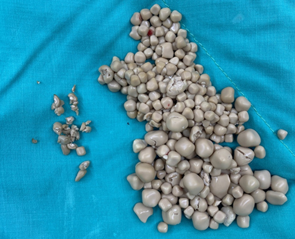 Bác sĩ Lin kể lại: “Vì bệnh nhân bị sốt nên trước tiên chúng tôi đã tiêm kháng sinh và đặt ống thông thận qua da để giảm phù thận cũng như nhiễm trùng đường tiết niệu. Sau đó, buộc phải phẫu thuật mới có thể giải quyết số lượng sỏi thận lớn đến như vậy. Phẫu thuật lấy sỏi thận qua da xâm lấn tối thiểu đã lấy ra hơn 300 viên sỏi, chúng có bề mặt nhẵn mịn giống như những chiếc bánh hấp nhỏ, kích thước lớn nhất là 2,1cm”.