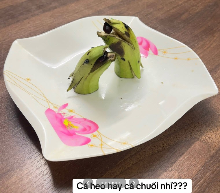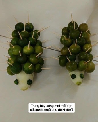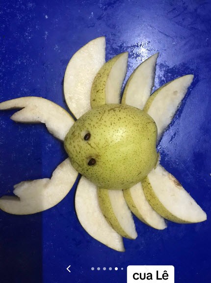 Tuy nhiên khác với những hình ảnh con vật đẹp long lanh được trang trí từ rau củ quả mà cô gửi tặng, các em học sinh cùng bố mẹ tạo hình con vật từ hoa quả, củ qua rất độc đáo và không kém phần hài hước.