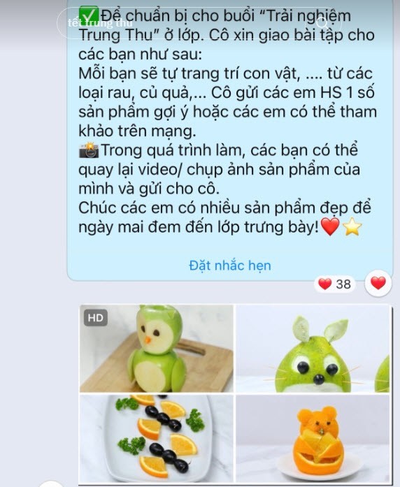 Cụ thể, bài chia sẻ từ bạn Quỳnh Anh bao gồm cả lời yêu cầu từ cô giáo "Để chuẩn bị cho buổi Trải nghiệm Trung Thu ở lớp, cô xin giao bài tập cho các bạn như sau: Mỗi bạn sẽ tự trang trí con vật... từ các loại rau củ quả... Cô gửi các em học sinh một số sản phẩm gợi ý hoặc các em có thể tham khảo trên mạng".