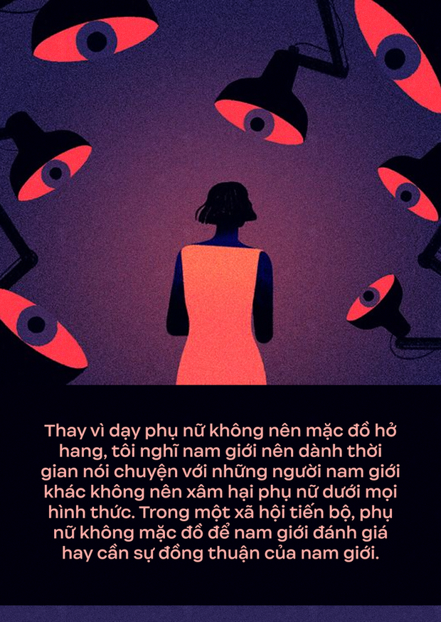 Thay vì dạy phụ nữ không nên mặc đồ hở hang, tôi nghĩ nam giới nên dành thời gian nói chuyện với những người nam giới khác không nên xâm hại phụ nữ dưới mọi hình thức. Trong một xã hội tiến bộ, phụ nữ không mặc đồ để nam giới đánh giá hay cần sự đồng thuận của nam giới.