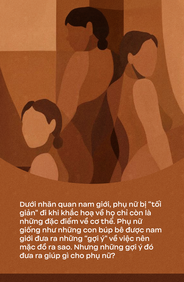 Dưới nhãn quan nam giới, phụ nữ bị “tối giản" đi khi khắc họa về họ chỉ còn là những đặc điểm về cơ thể. Phụ nữ giống như những con búp bê được nam giới đưa ra những “gợi ý" về việc nên mặc đồ ra sao. Nhưng những gợi ý đó đưa ra giúp gì cho phụ nữ? Để không bị “trai khác nhìn"? Để tránh bị “xâm hại tình dục" (bởi nam giới)? Mặc đồ kín đáo hơn để nam giới yêu họ hơn? “Con trai nhìn con gái mặc hở chỉ thích chọc ghẹo thôi”?... Khó có thể nhìn thấy những lập luận phù hợp về việc tại sao phụ nữ “nên mặc đồ kín đáo" vì lợi ích của phụ nữ.