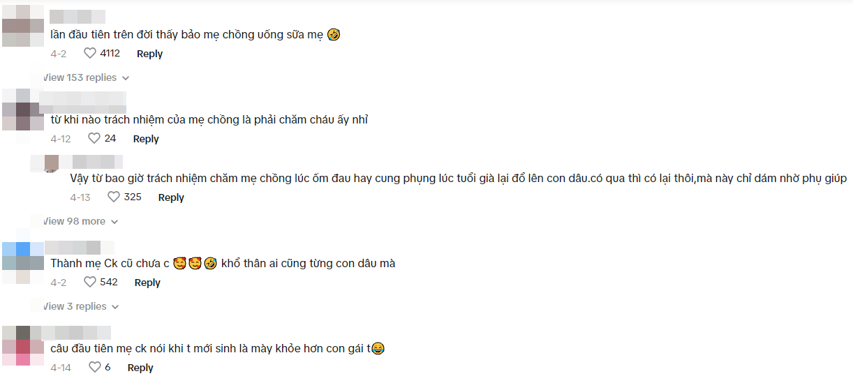 Đồn con dâu khắp xóm làm biếng, không biết điều. Chuyên gia nói xấu mình với chồng để 1 vợ chồng cãi lộn. Sữa mẹ nhiều nhưng không cho trữ đông bỏ tủ, kêu mất chất, đổ thì sợ bị hôi sữa. Bà uống hết. Xúc phạm coi thường con dâu, khinh thường gia đình con dâu nghèo khổ, đời đời con nhớ ơn mẹ", người này kể.