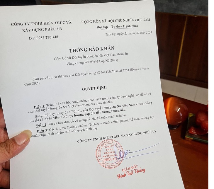 Sáng 22-7, Báo Tuổi Trẻ Online thông tin trên trang Facebook cá nhân của mình, ông Đinh Tất Thắng - giám đốc Công ty TNHH kiến trúc và xây dựng Phúc Uy (địa chỉ tại TP Tam Kỳ, Quảng Nam) - có đăng thông báo khẩn gửi nhân viên công ty mình, liên quan đến việc cổ vũ đội tuyển nữ Việt Nam tham dự vòng chung kết World Cup nữ 2023.