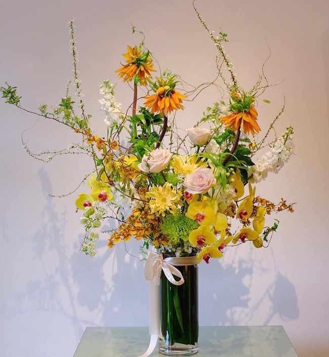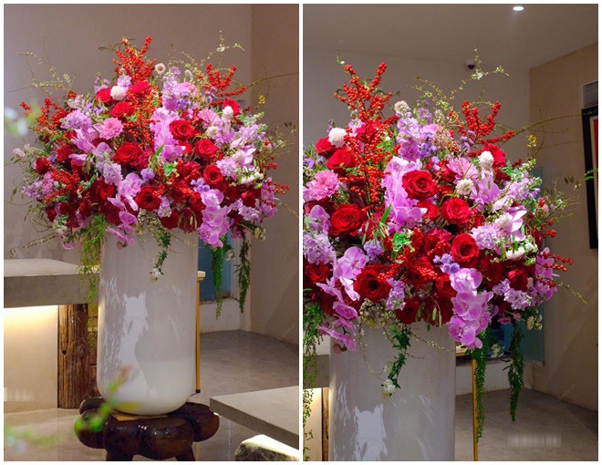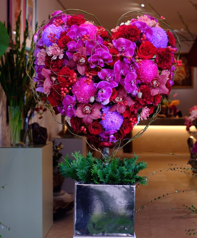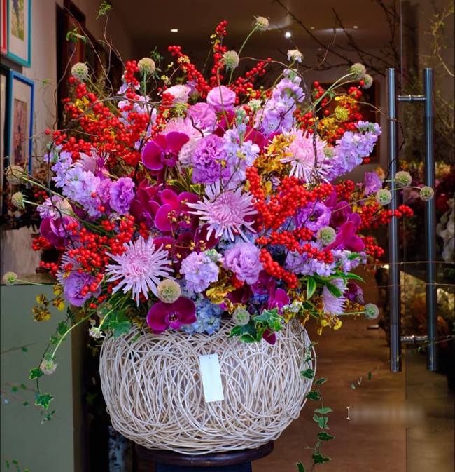 Theo lời anh Khôi, lẵng hoa đắt tiền nhất của shop làm để khách tặng vợ trị giá 50 triệu đồng. Để cắm được lẵng hoa này phải mất khoảng 5 tiếng. Trong lẵng có các loại hoa sang trọng như hoa hồng Ecuador, hoa đào đông đỏ, lan hồ điệp. Mỗi loại hoa có vẻ đẹp riêng nhưng tổng thể là màu sắc rực rỡ như gửi gắm mong muốn người vợ luôn tỏa sáng và rạng rỡ như những đóa hoa.