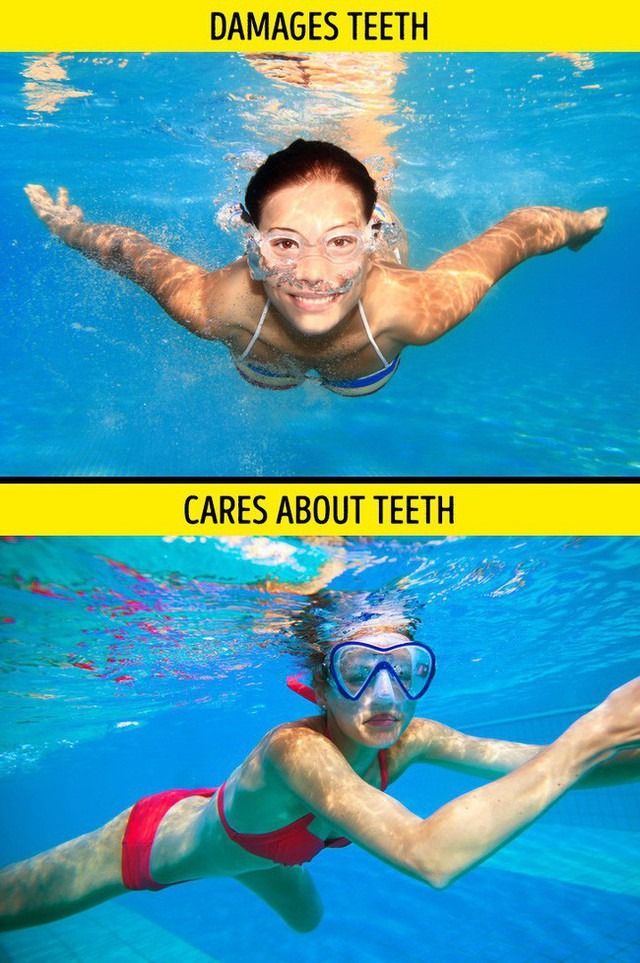 Không ai nói rằng bơi lội không có lợi cho sức khỏe nhưng vấn đề ở đây là các hóa chất được sử dụng để khử trùng nước trong một số hồ bơi có tác động khủng khiếp lên răng. Các nhà nghiên cứu tại Đại học Nha khoa NYU College of Dentistry đã cảnh báo về sự nguy hiểm của các hồ bơi có nguồn nước được bảo quản không đúng cách. Tiến sĩ Leila Jahangiri của trường Đại học Nha khoa New York cảnh báo về sự nguy hiểm của sự xói mòn men răng nghiêm trọng và nhanh chóng do nước ở các bể bơi.