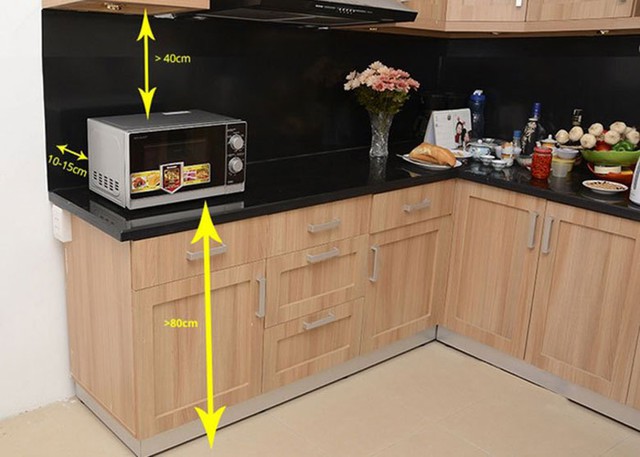 Còn với những gia đình lựa chọn lắp đặt lò vi sóng âm vào tủ bếp, hãy tham khảo tư vấn sau. Đó là các cạnh của thiết bị cách xa các cạnh tủ từ 5-15cm.