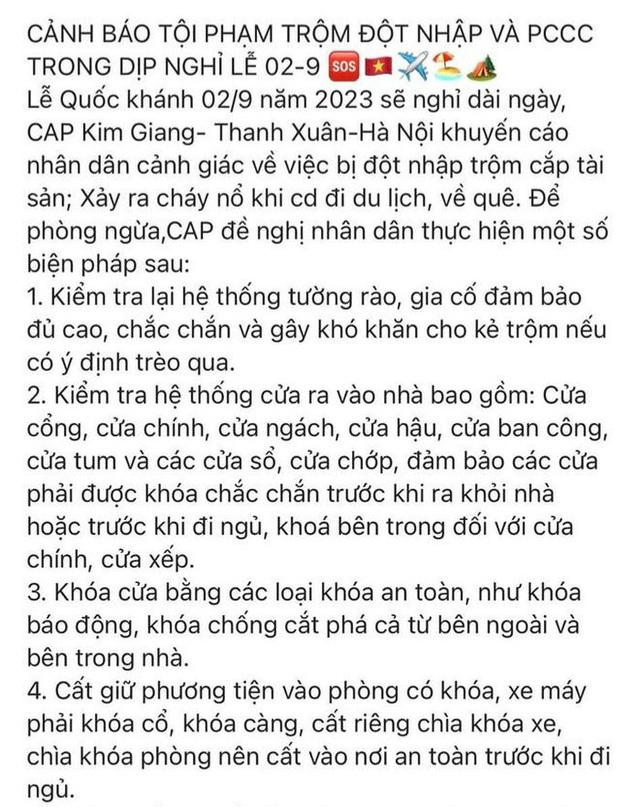 Theo cơ quan Công an, dịp nghỉ Lễ Quốc khánh 2/9 năm 2023, nhân dân cả nước được nghỉ 4 ngày, chính vì vậy đây là dịp để người dân tham gia, tổ chức các hoạt động du lịch, về thăm quê dài ngày. Điều này, tạo cơ hội cho các loại tội phạm, nhất là trộm đột nhập có chiều hướng gia tăng.