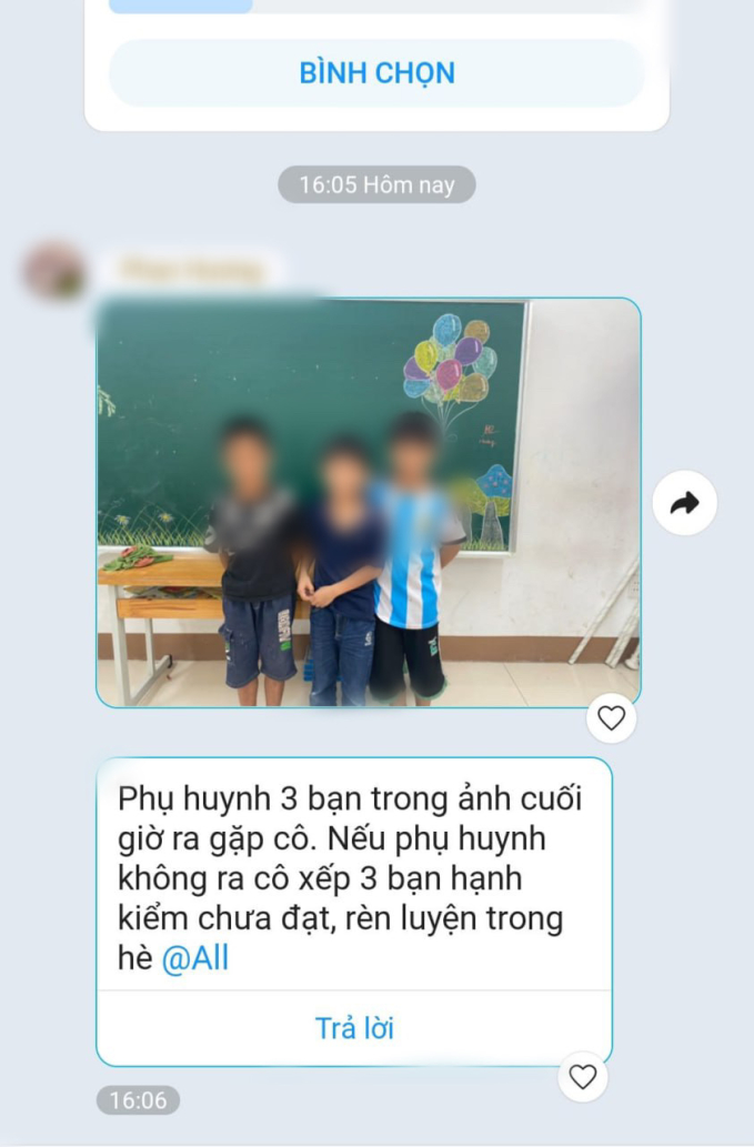 Mới đây, một bà mẹ đã đăng đàn "bóc phốt" cô giáo trong một hội nhóm phụ huynh có con học tiểu học. Chuyện bắt đầu từ tin nhắn của cô giáo chụp một bức ảnh 3 bạn học sinh kèm lời nhắn được đăng tải trên nhóm lớp chung: "Phụ huynh 3 bạn trong ảnh cuối giờ ra gặp cô. Nếu phụ huynh không ra cô xếp 3 bạn hạnh kiểm chưa đạt rèn luyện trong hè".