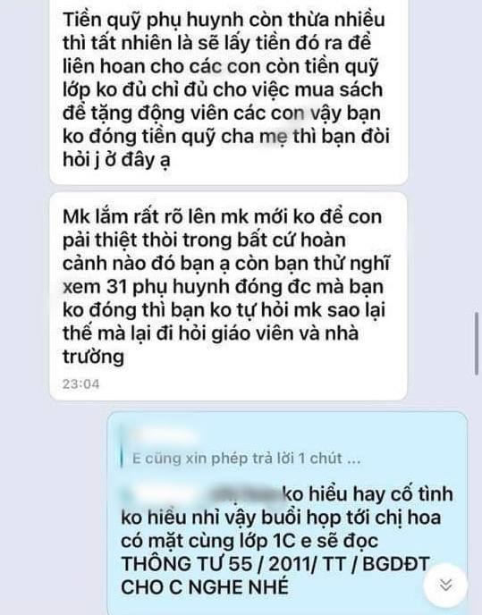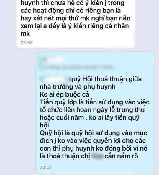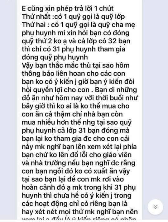 Đáp lại, vị phụ huynh kia cho hay đúng là tiền quỹ phụ huynh còn thừa nhiều sẽ trích ra để tổ chức liên hoan cho các con, song tiền quỹ lớp không đủ nên không thể hỗ trợ được: "Bạn thử nghĩ xem 31 phụ huynh đóng được mà bạn không đóng thì bạn không hỏi mình tại sao, mà lại đi hỏi giáo viên và nhà trường".