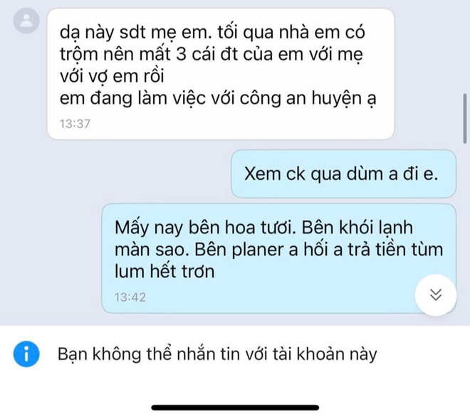 Đáng chú ý, trong đoạn tin nhắn được chủ bài viết công khai, có đoạn chú rể đưa lí do chậm trả tiền là do: "Tối qua nhà em có trộm nên mất 3 cái điện thoại của em, mẹ với vợ em rồi. Nhà vừa có chuyện không hay, anh thông cảm cho em ít ngày. Gia đình đang rối ren mong anh đừng gọi!".