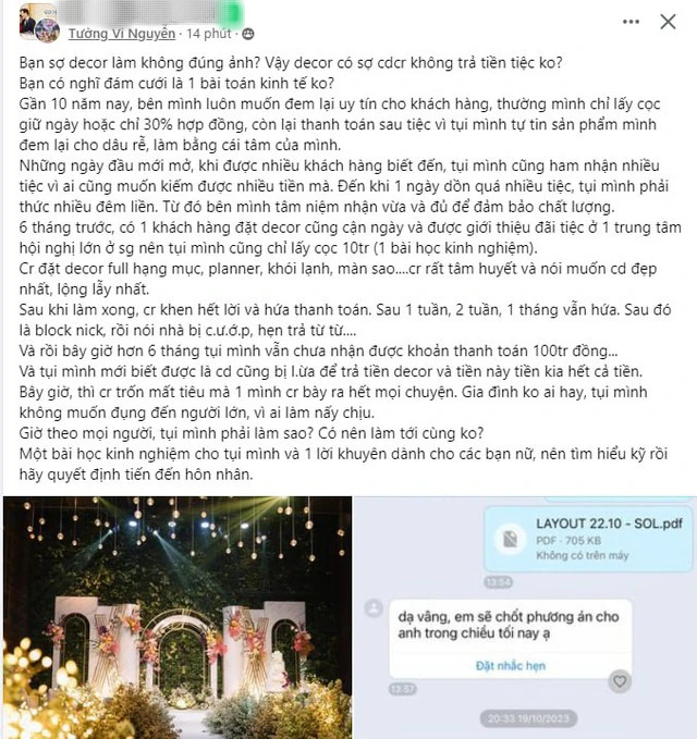 Tuy nhiên, mới đây, lại có trường hợp ngược đời xảy ra khiến dân tình cảm thấy bức xúc. Cụ thể, chủ 1 đơn vị decor ở Tp.HCM đã đăng đàn "bóc phốt" cặp cô dâu chú rể mới cưới "quỵt" tiền không trả, chú rể bỏ trốn, cô dâu "bơ" đẹp.