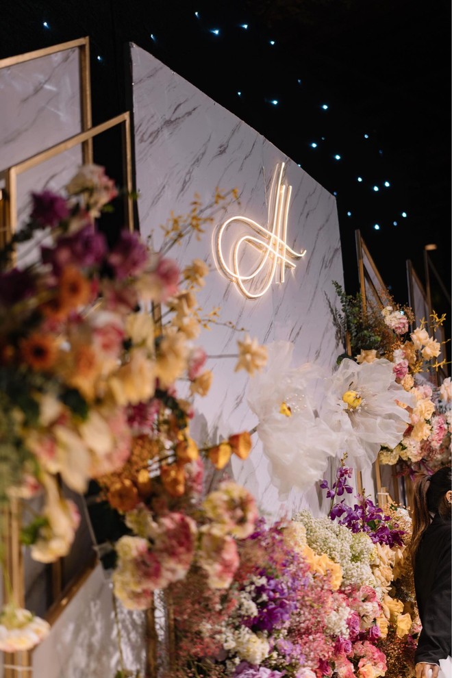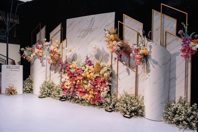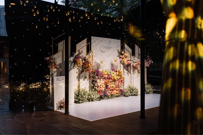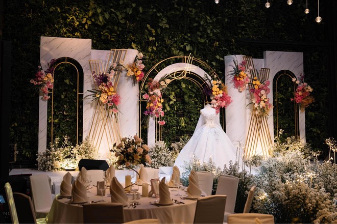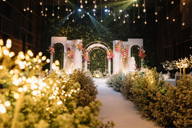 Dù đặt sát ngày tổ chức nhưng phía đơn vị đã hoàn thành đúng hạn và đúng theo mong đợi của cặp đôi. Hội trường buổi hôn lễ vô cùng lung linh với đèn vàng, hoa tươi... như khu vườn cổ tích. Được biết, tổng chi phí cặp đôi phải chi trả cho phần decor này là 112 triệu đồng.