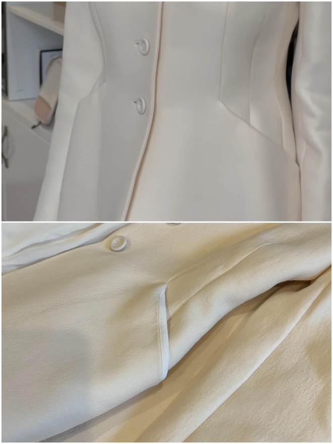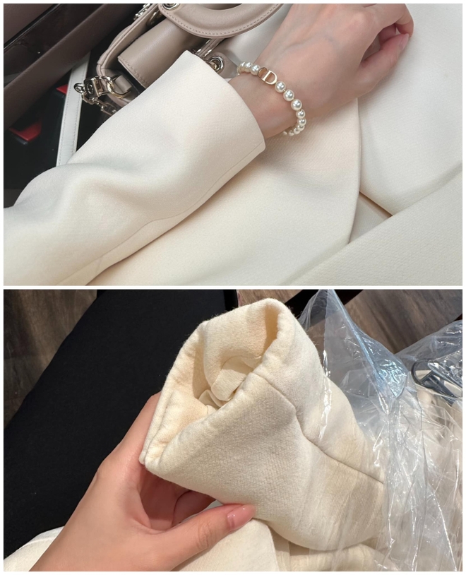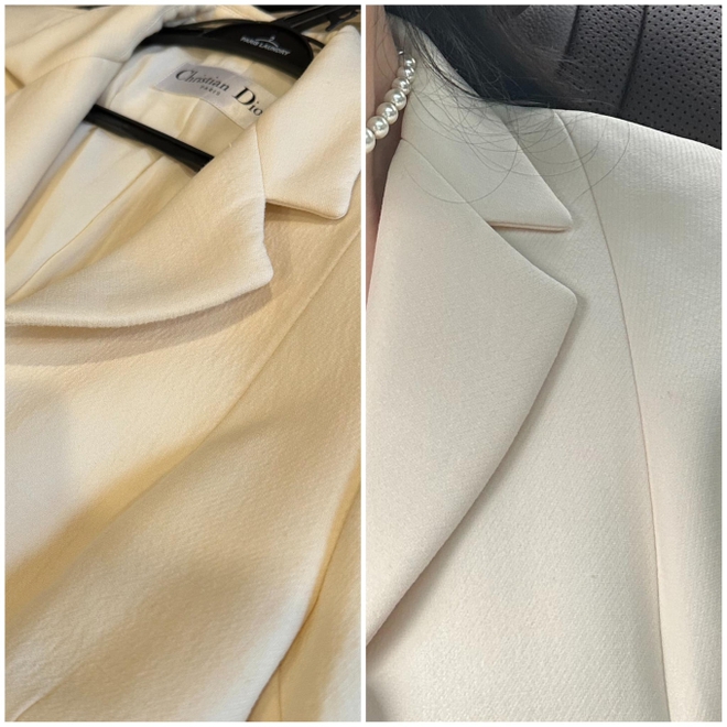 “Mình đã đưa đồ về lại bên giặt là yêu cầu giải thích nhưng chưa nhận được câu trả lời thoả đáng. Mình cũng mang qua store của Dior để xin ý kiến về tình trạng bộ đồ, nhân viên cũng xác nhận là bề mặt vải này chắc chắn đã bị ngấm nước hoặc dùng nhiệt độ cao khiến vải bị co rút. Bộ đồ đã bị co 1, 2 size so với lúc ban đầu”, Ngọc Châm chia sẻ.