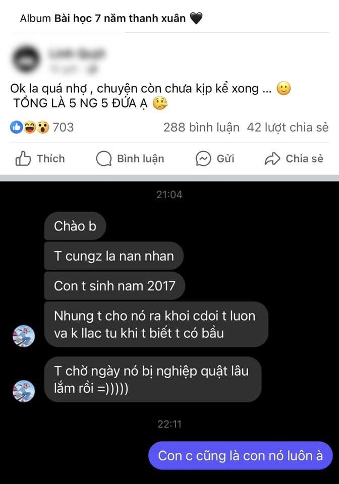 Đứa thứ nhất cách đứa thứ hai 2 tháng, đứa thứ ba cách đứa thứ tư 2 tháng. Chính thất, bạn nữ, hàng xóm nhà anh, cô em đồng nghiệp vợ, chưa kể các mập mờ khác, không ai biết chuyện.
