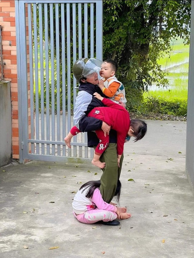 Mới đây, một mẹ bỉm chia sẻ khoảnh khắc các cháu tạm biệt ông ngoại để trở về nhà. Giây phút chia xa không bé nào muốn, các con nhất quyết ôm chặt ông. Chị lớn ngồi bệt xuống, dùng cả người ôm chặt 2 chân ông, 2 bạn bé được ông bế trên tay, thi nhau thơm, ôm ông thật chặt. Tình cảnh này khiến ông ngoại đứng im, chẳng di chuyển nổi, lặng lẽ ôm lấy các cháu dù mũ bảo hiểm vẫn còn đội trên đầu.