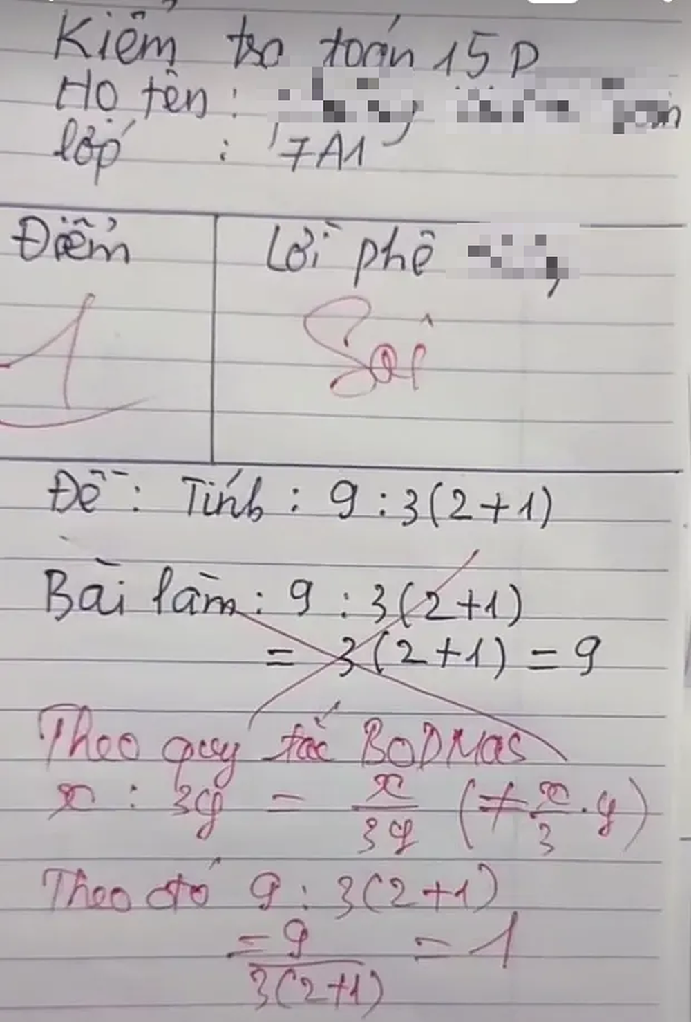 Đáp án sau đó được người chấm bài sửa lại thành 1, với cách làm khác, áp dụng theo quy tắc Bodmas (thứ tự ưu tiên sẽ là dấu ngoặc, chia, nhân, cộng, trừ từ trái qua phải). Trên mạng xã hội, hàng trăm ý kiến trái chiều được đưa ra. Số người cho là 9 không hề ít, mà người cho đáp án là 1 cũng chẳng kém cạnh. Mỗi bên đều đưa ra những lý lẽ khác nhau, không ai chịu ai.