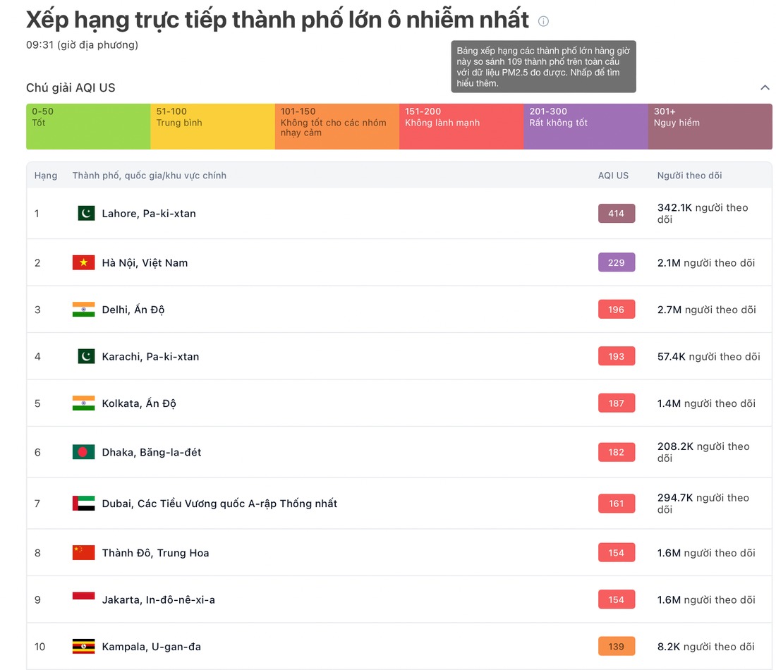 Ứng dụng AirVisual ghi nhận chỉ số chất lượng không khí Hà Nội lúc 9h sáng nay (29/11) là 239 – ngưỡng tím, rất có hại cho sức khỏe mọi người, là thành phố ô nhiễm thứ 2 thế giới trong sáng nay, chỉ sau thành phố Lahore của Pakistan.