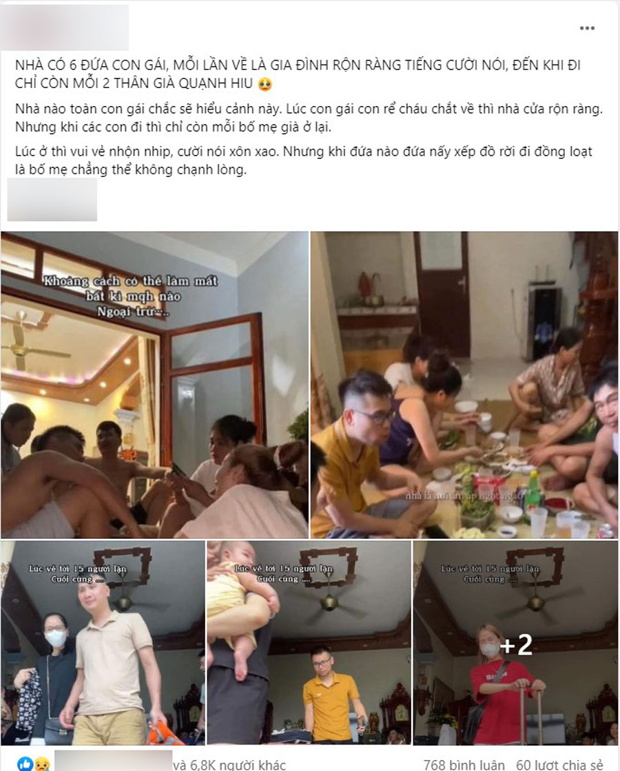 Nhà nào toàn con gái chắc sẽ hiểu cảnh này. Lúc con gái con rể cháu chắt về thì nhà cửa rộn ràng, nhưng khi các con đi thì chỉ còn mỗi bố mẹ già ở lại.