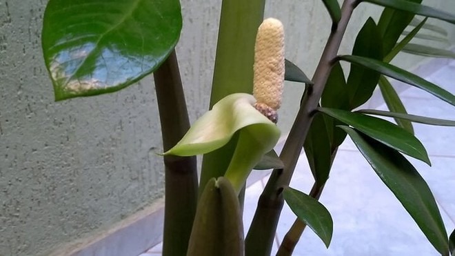 Cây kim tiền nếu được chăm đúng cách có thể ra hoa vào giai đoạn có đủ cành nhánh, và thường vào mùa xuân, mùa thu. Đó là lý do người trồng thường bón phân kích thích cây ra hoa vào những thời điểm này.