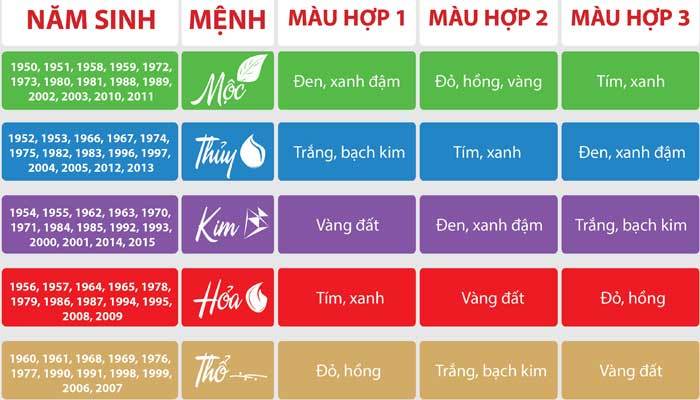 Căn cứ vào bảng tương quan màu sắc với từng mệnh dưới đây để tìm cây phong thủy phù hợp với mệnh của mình.