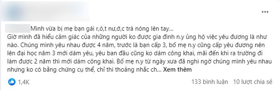 "Mình vừa bị mẹ bạn gái rót nước trà nóng lên tay… Giờ mình đã hiểu cảm giác của những người không được gia đình người yêu ủng hộ việc yêu đương là như nào. Chúng mình yêu nhau được 4 năm, trước là bạn cấp 3, bố mẹ người yêu cũng cấm yêu đương nên lên đại học năm 3 mới dám yêu. Yêu ban đầu cũng không dám công khai, mãi đến khi ra trường đi làm được 2 năm thì mới dám công khai. Bố mẹ người yêu từ ngày xưa đã nghi ngờ chúng mình yêu nhau nhưng không có bằng chứng cụ thể, chỉ thi thoảng nhắc chuyện là người yêu không nên yêu mình… vì sau này sẽ khổ.