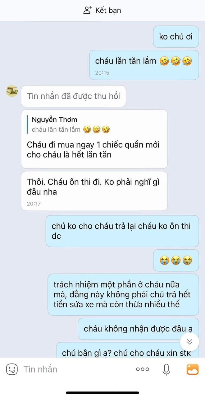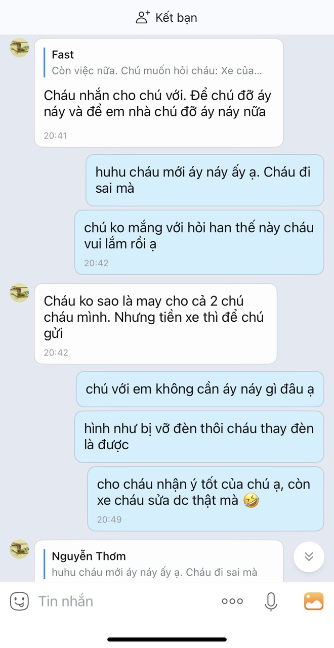 Rồi chú chuyển cho em 2 triệu tiền sửa xe, mặc dù em đã nói đây là lỗi của em và xe sửa cũng không hết nhiều tiền như vậy. Em thấy nhiều quá, đòi trả lại ngay lúc đó nhưng chú bảo em cầm để đi sửa cho tự tin.