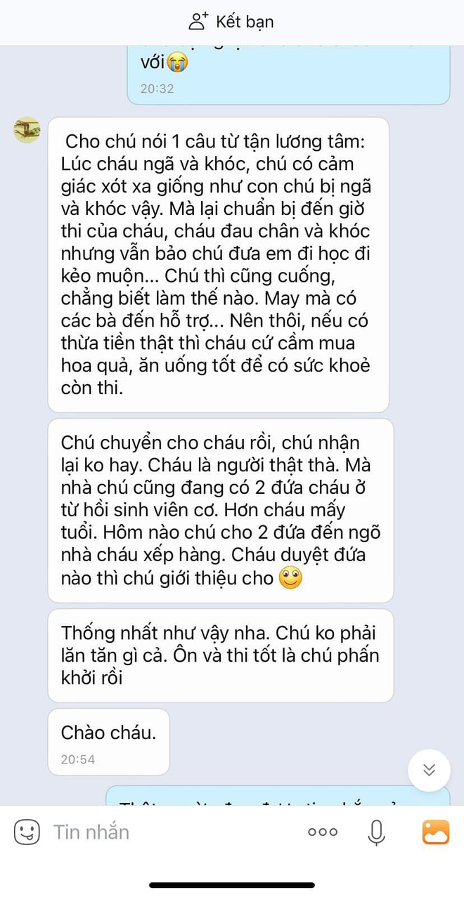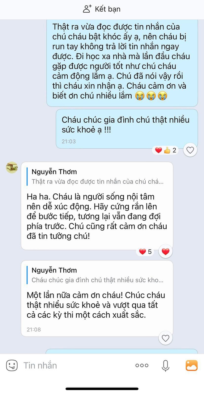 Theo Nguyễn Thơm, khi đọc những dòng tin nhắn hỏi thăm, động viên của chú, cô không kìm được nước mắt mà bật khóc vì xúc động trước lòng tốt của một người xa lạ.