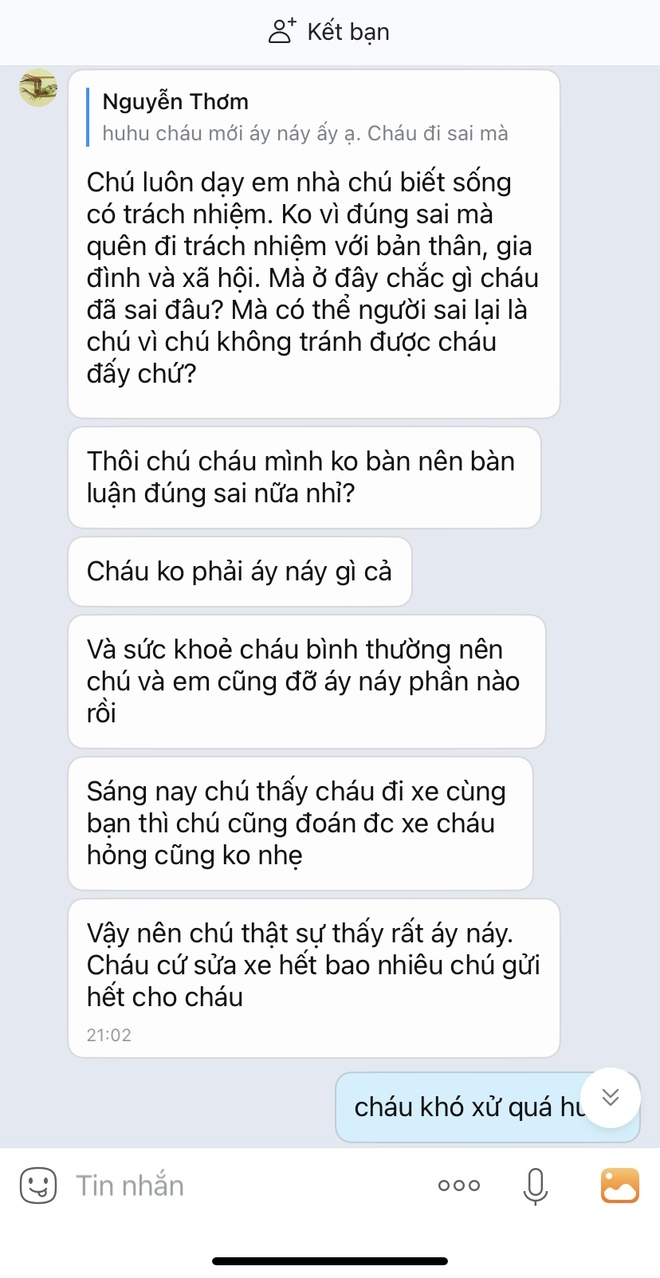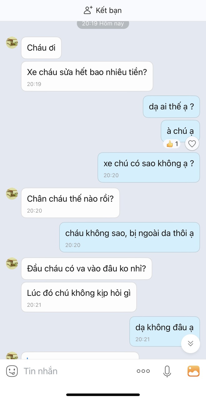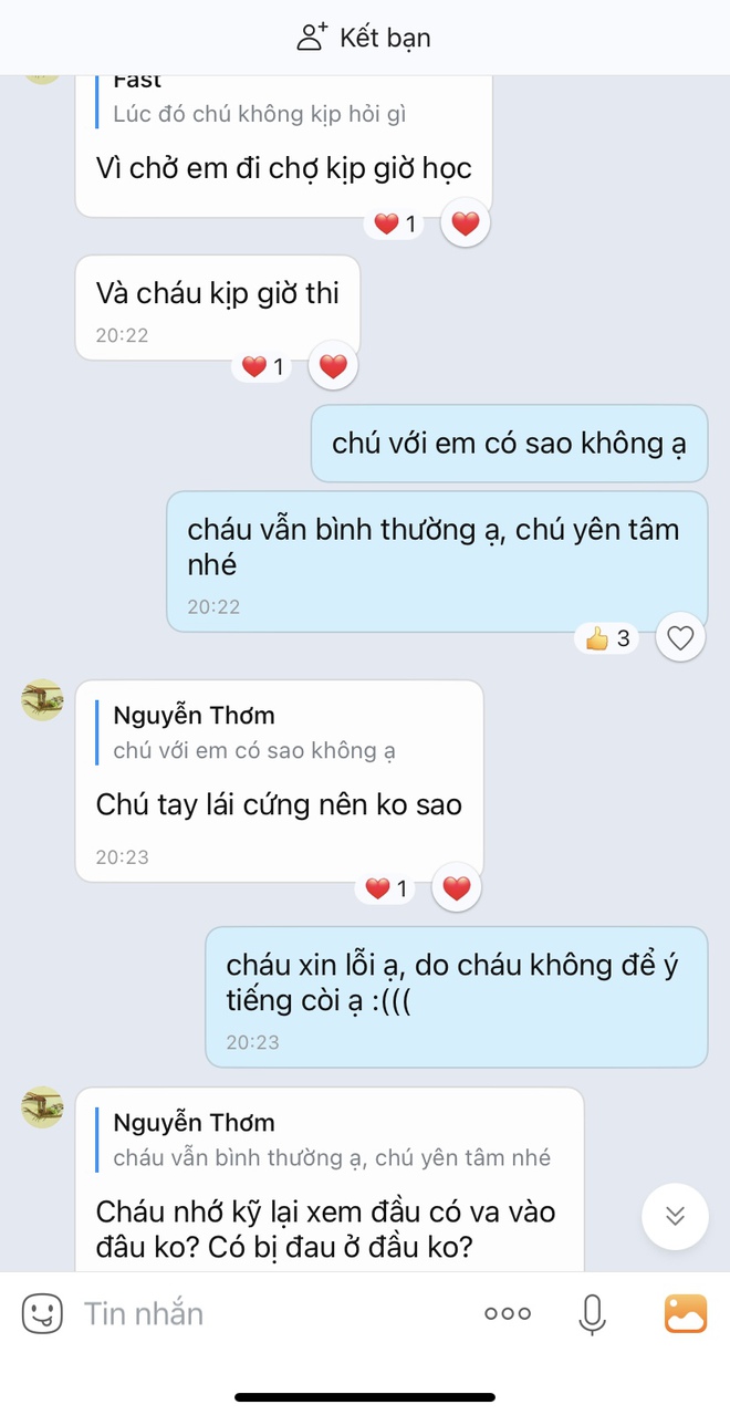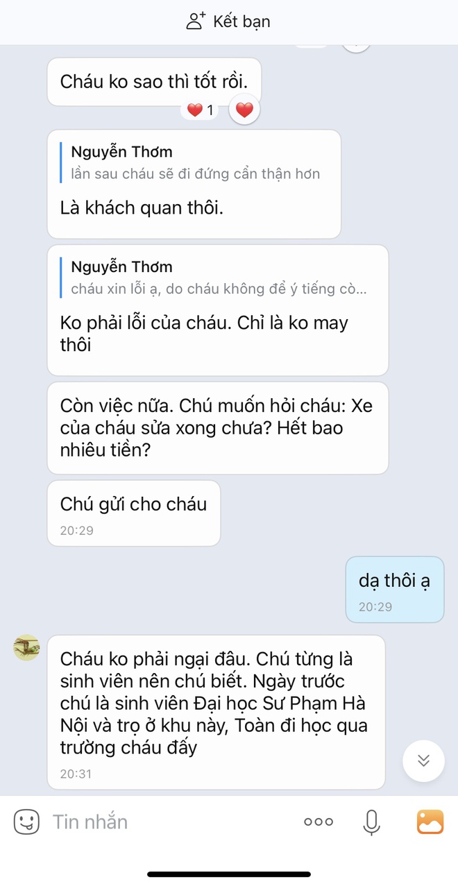 "Chú đứng chờ em đi qua ngõ để hỏi thăm sức khỏe, rồi dặn em có bị làm sao thì phải liên lạc cho chú. Thế rồi tối về em nhận được tin nhắn Zalo của chú, hỏi em có cần đi chụp chiếu, kiểm tra sức khỏe gì không.