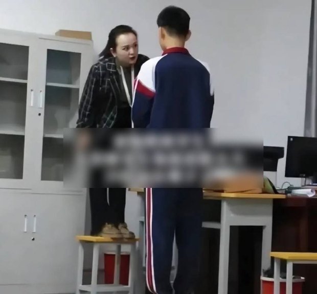 Không rõ cậu học sinh đang học cấp THCS hay THPT và mắc phải lỗi gì nhưng em này có vóc dáng cực kỳ cao lớn. Chính vì vậy khi mắng em, cô giáo đã phải... đứng lên một chiếc ghế thì mới có thể nói chuyện "mặt đối mặt" với học sinh.