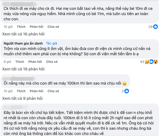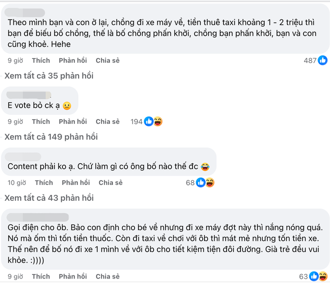 Dưới phần bình luận, nhiều người tỏ ra không đồng ý với thái độ của người chồng, em bé mới 10 tháng, sức đề kháng còn yếu nên việc để con đi ngoài trời nắng suốt 100km thực sự không nên. Khi con nhỏ thì ưu tiên giữ sức khỏe và đi taxi là giải pháp tốt nhất. Nhiều người khuyên nếu không thể nói chuyện với chồng thì tốt nhất 2 mẹ con nên tự đi taxi về hoặc ở lại Hà Nội, sức khỏe của em bé là trên hết.