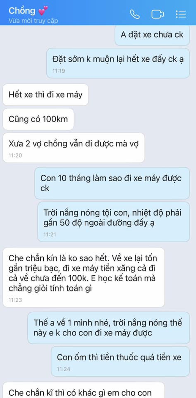 Cụ thể, người chồng cho rằng: "Hết taxi thì đi xe máy, có 100km, xưa 2 vợ chồng đi được mà. Che kín không sao hết, về lại tốn triệu bạc, xe máy chỉ mất 100k. Em học kế toán mà chẳng giỏi tính toán gì cả. Che chắn kĩ thì khác gì em cho con chơi ở sân không bật quạt đâu, đi đường còn gió mát cơ mà". Vợ thì cho rằng: "Con mới 10 tháng, trời nóng tội con, nhiệt đô ngoài đường 50 độ đấy".