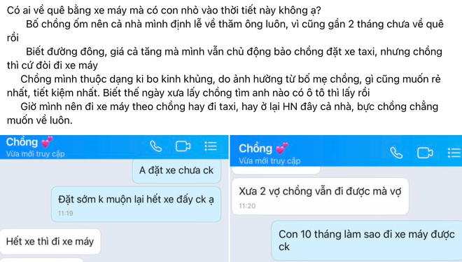 Giờ mình nên đi xe máy theo chồng hay đi taxi, hay ở lại Hà Nội đây cả nhà, bực chồng chẳng muốn về luôn", người mẹ chia sẻ.