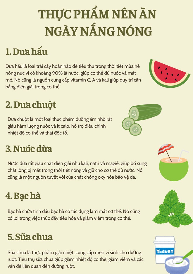 Thực phẩm có thể giải nhiệt cho chúng ta trong mùa hè là những thực phẩm có hàm lượng nước cao. Ăn những thực phẩm này có thể giúp giảm nhiệt độ cơ thể và khiến chúng ta cảm thấy thoải mái hơn khi trời nóng. Mặt khác, ăn nhiều đồ ăn nhiều chất béo, cay nóng có thể khiến chúng ta cảm thấy nóng nực, khó chịu, nhất là trong những ngày nắng nóng cực điểm như thời gian này. Những thực phẩm này cũng có thể làm tăng huyết áp, khiến chúng ta cảm thấy uể oải và kém hiệu quả.