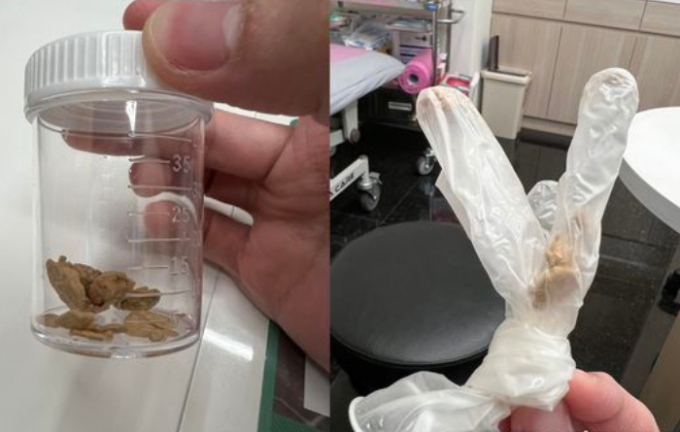 Anh này 30 tuổi, làm việc xa nhà và sống một mình tại Đài Trung (Đài Loan, Trung Quốc) từ khi còn rất trẻ. Gần đây, khi đang tắm thì anh nhìn xuống và đột nhiên phát hiện ra viên gì đó trông như đá, hơi cứng và có màu vàng. Lúc đầu, anh tưởng là đất đá bẩn vô tình bị bám theo vào phòng tắm, nhưng khi vừa dọn xong, xả nước kỳ cọ bộ phận sinh dục thì lại thấy rơi ra thêm vài viên. Điều đầu tiên anh nghĩ tới là mình đã bị sỏi thận, nhưng lại cảm thấy khó hiểu vì mình không hề cảm thấy đau hay ngứa gì.