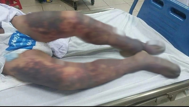 Bệnh nhân nhập viện trong tình trạng thở ôxy, đồng tử 2 bên giãn 4mm, huyết áp không đo được, toàn thân nổi vân tím, ban xuất huyết hoại tử vùng mặt, tay và chân.