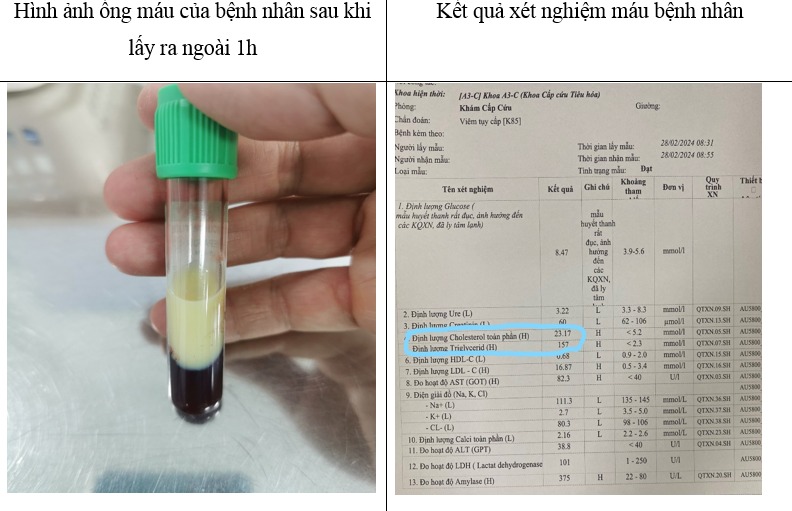 Theo Arttimes thông tin, bệnh nhân nam đến từ Hà Nội, đã điều trị viêm tụy cấp 6 lần ở các bệnh viện tuyến trước, lần này bệnh nhân nhập viện vào Khoa Cấp cứu tiêu hóa trong tình trạng mệt mỏi, đau bụng dữ dội. Kết quả chụp CLVT ổ bụng có hình ảnh viêm tụy cấp phù nề, xét nghiệm men tụy tăng cao, mức độ triglyceride lúc vào là 157mmol/L. Bệnh nhân đã được điều trị bằng truyền dịch, giảm đau và hạ mỡ máu bằng truyền insulin đường tĩnh mạch. Sau 1 tuần điều trị, bệnh nhân đã hết đau bụng, mức độ mỡ máu về giới hạn cho phép và được xuất viện.