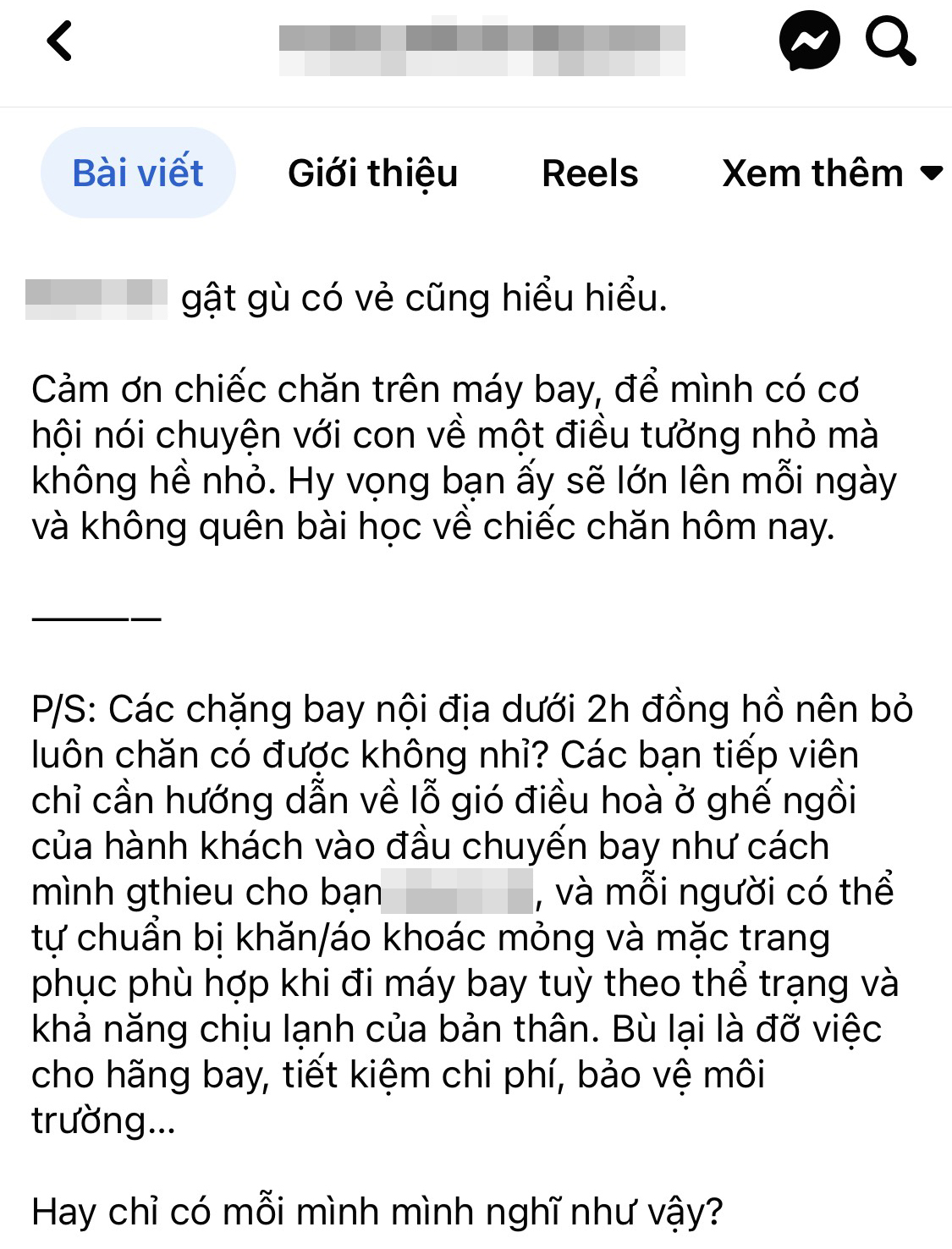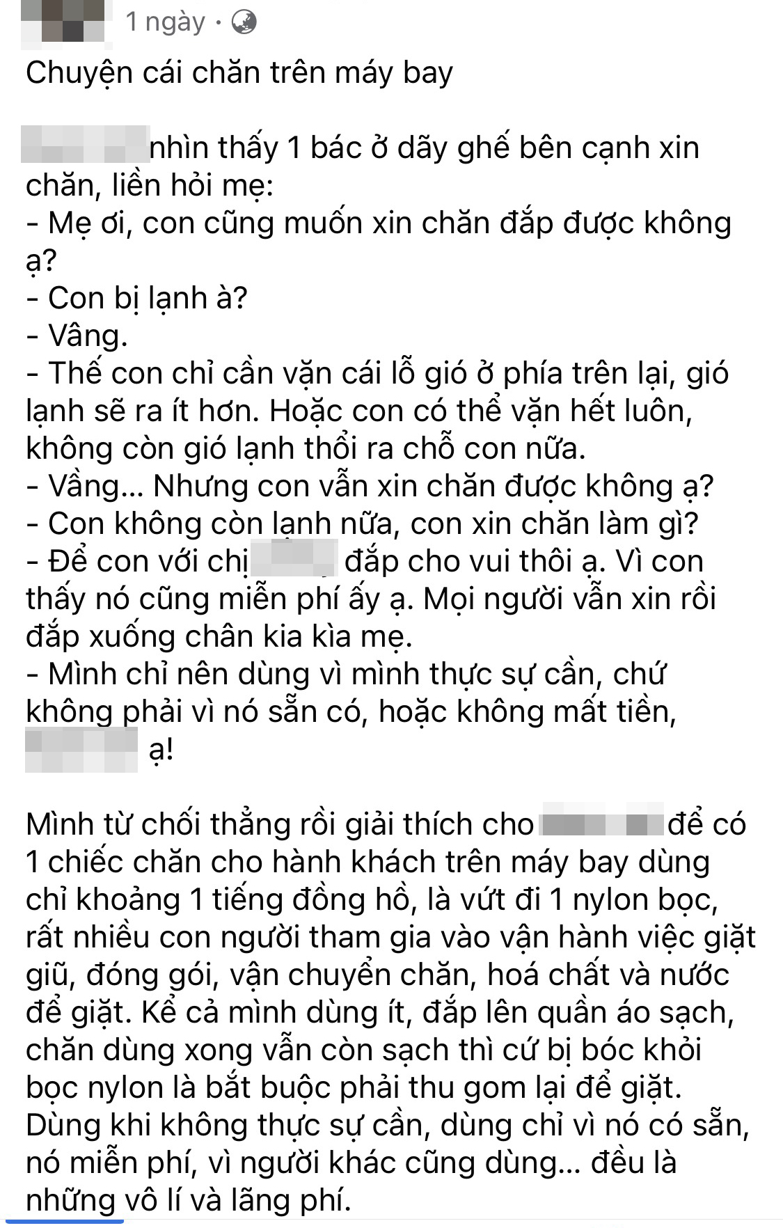 Ngoài thuật lại cuộc trò chuyện với người con, bà mẹ này còn đưa ra đề nghị về việc phục vụ chăn trên máy bay. Nguyên văn quan điểm: "Các chặng bay nội địa dưới 2 giờ đồng hồ nên bỏ luôn chăn có được không nhỉ? Các bạn tiếp viên chỉ cần hướng dẫn về lỗ gió điều hòa ở ghế ngồi của hành khách vào đầu chuyến bay như cách mình giới thiệu cho con, và mỗi người có thể tự chuẩn bị khăn/áo khoác mỏng và mặc trang phục phù hợp khi đi máy bay, tùy theo thể trạng và khả năng chịu lạnh của bản thân. Bù lại là đỡ việc cho hãng bay, tiết kiệm chi phí, bảo vệ môi trường".