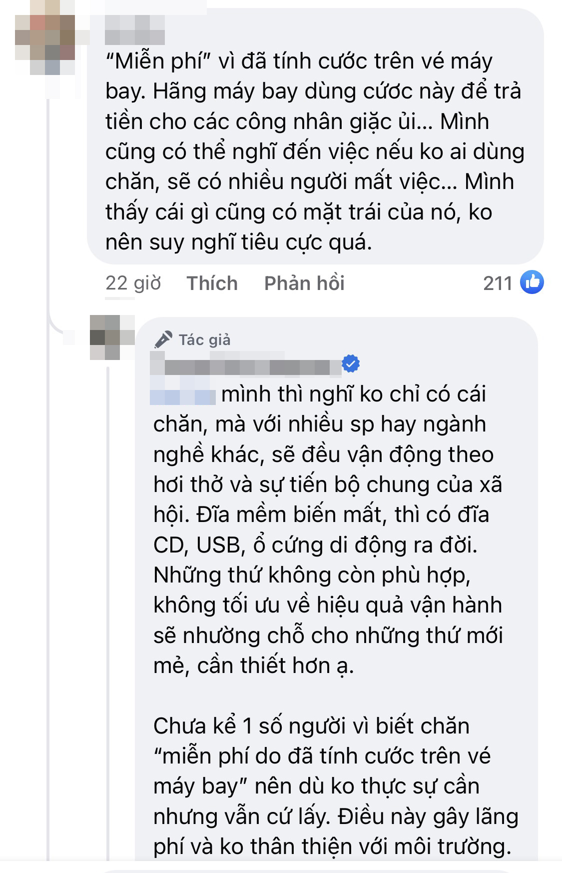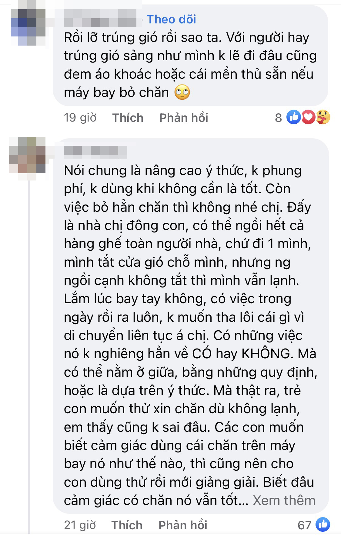 "Thật sự thấy ý tưởng bảo vệ môi trường này của chủ thớt không hợp lý tí nào. Bỏ tiền ra mua vé máy bay thấy xứng đáng nhất là để được hưởng dịch vụ tương xứng với số tiền mình bỏ ra, xin một cái chăn thay vì phải chịu lạnh cả một quãng đường đi rồi lên xuống, nắng nôi. Còn vấn đề bảo vệ môi trường thì rõ ràng hãng sẽ phải có trách nhiệm xử lý. Cả một hãng hàng không, không giặt một cái chăn thì họ cũng sẽ phải giặt nhiều cái chăn khác. Và hơn hết, người đi làm người ta cần công việc đó, hãng bỏ cả khâu thì chắc chắn sẽ phải cắt bỏ nhân công, mình không nên đánh giá một cách chủ quan như vậy. Còn khi em bé không thật sự cần chăn và vẫn xin thì em ủng hộ cách dạy quả quyết của chị, vì đó là việc nên làm”.