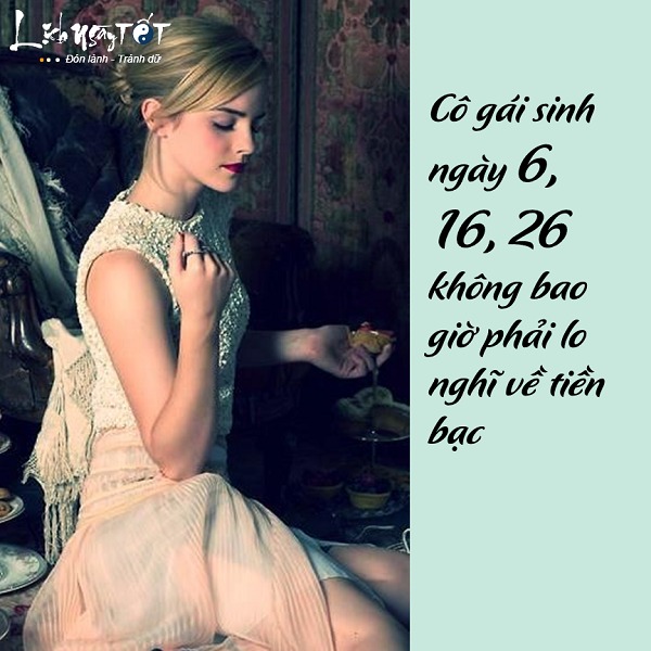 Trong tử vi phương Đông, con số 6 là con số được yêu thích vô cùng, bản thân nó đã toát lên sự thuận lợi, sung túc và hạnh phúc. Xem bói ngày sinh, những cô gái sinh vào ngày 6, 16, 26 âm lịch được trời ban tặng nhiều điều tốt lành từ khi mới sinh ra. Từ nhỏ đã là những nàng công chúa trong vòng tay bố mẹ, anh chị, lớn lên có bạn bè giúp đỡ, dường như không một khó khăn nào dám cản trở con đường tiến bước của cô gái này.