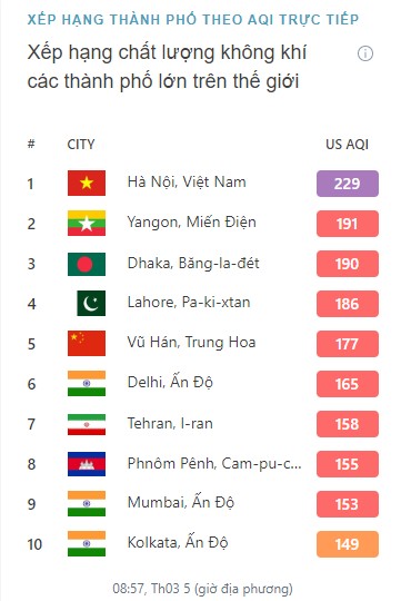 Tính đến 9h sáng 5/3, theo IQAir (ứng dụng theo dõi chất lượng không khí trên toàn thế giới) TP Hà Nội đang đứng số 1 thế giới về chỉ số ô nhiễm không khí. Theo đó, chỉ số AQI (chất lượng không khí) của Hà Nội là 229 - ở mức cảnh báo rất không tốt cho sức khỏe con người.