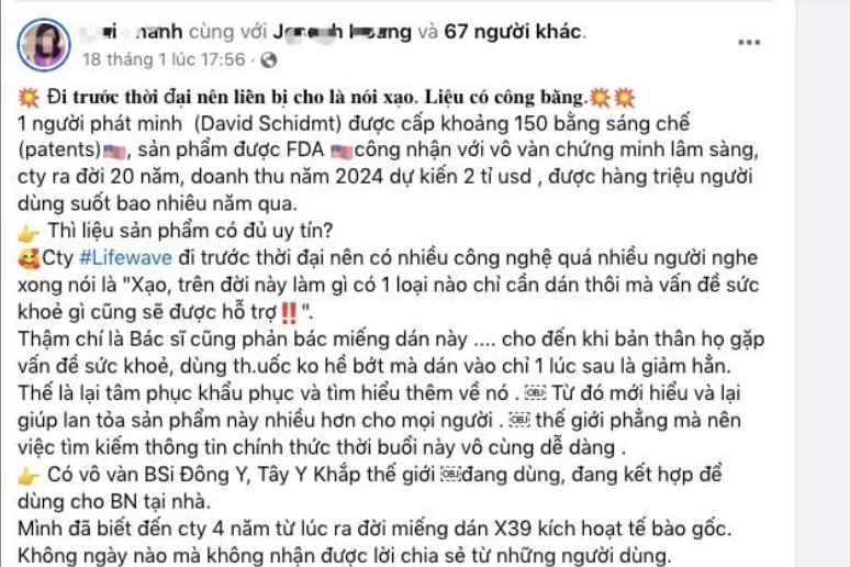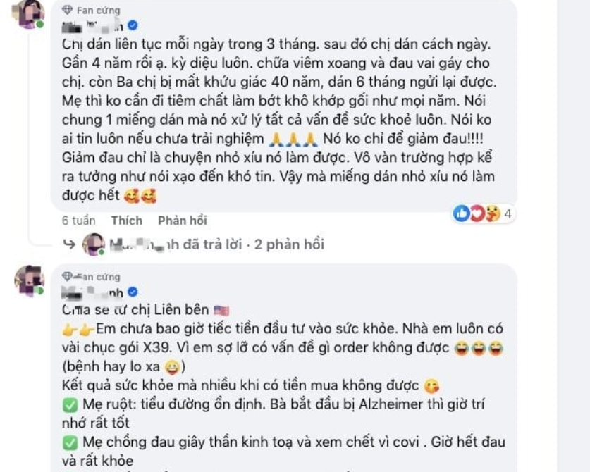 Gần đây, miếng dán kích hoạt tế bào gốc được nhiều người nổi tiếng quảng cáo là có tác dụng kỳ diệu. Trên Facebook được giới thiệu là "fanpage chính thức" của vợ chồng diễn viên H.Đ và Á hậu A.C (đang định cư ở Canada) có gần nửa triệu lượt theo dõi quảng cáo miếng dán X39 đang “cháy hàng”.